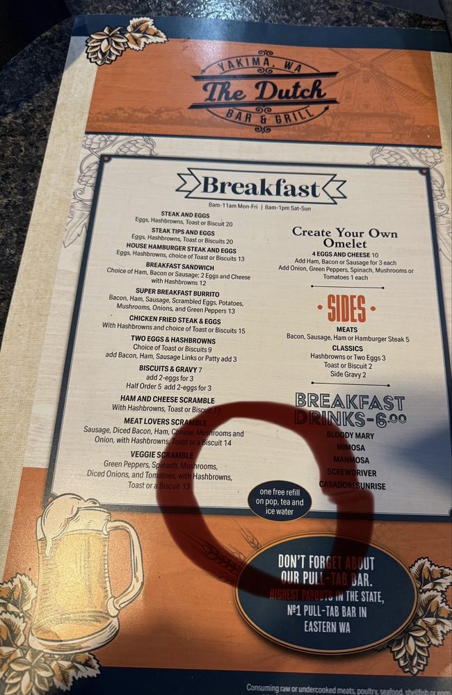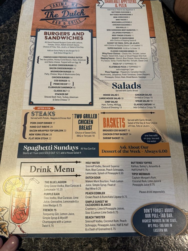 Welcome to The Dutch, a hidden gem nestled at 214 N 6th Ave, Yakima, WA. This charming dive bar transforms traditional expectations with a menu that delights. Pair your drinks with an impressive selection of dishes, including Traditional Wings, Boneless Wings, and creative sides like Potato Skins and Super Nachos for just $14.50. Patrons rave about the generous portions and flavorful offerings, making it evident that quality and care are paramount.